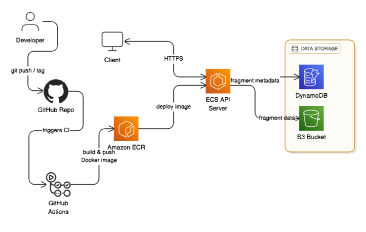 The system stores fragment data in Amazon S3 and metadata in Amazon DynamoDB, with full support for text, image, JSON, Markdown, HTML, and CSV conversions. The entire service is fully containerized and optimized for high reliability.