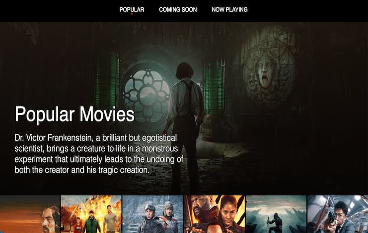 A cinematic movie browsing application built with React and Framer Motion. The interface features three main categories — Popular, Now Playing, and Coming Soon — allowing users to explore curated movie selections with smooth, visually appealing transitions.